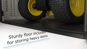 Here's where engineering meets reality: the reinforced floor. Most shed floors are afterthoughts—thin sheets that develop soft spots where mower wheels park. Suncast reinforced the high-traffic areas and wheel paths. A 46-inch zero-turn (roughly 1,200 pounds) rolls in and out daily without creating permanent depressions. The 60-inch door width means you're not threading a needle every time—critical when you're tired and just want to park the thing.
