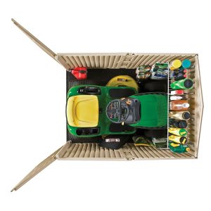 Real-world capacity: a 48-inch riding mower, push mower, wheelbarrow, and enough chemicals to qualify for an EPA inspection. The built-in shelf supports let you add organization without drilling into walls. Most users install 2x4 shelving for lighter items—the resin accepts screws despite what you might assume.